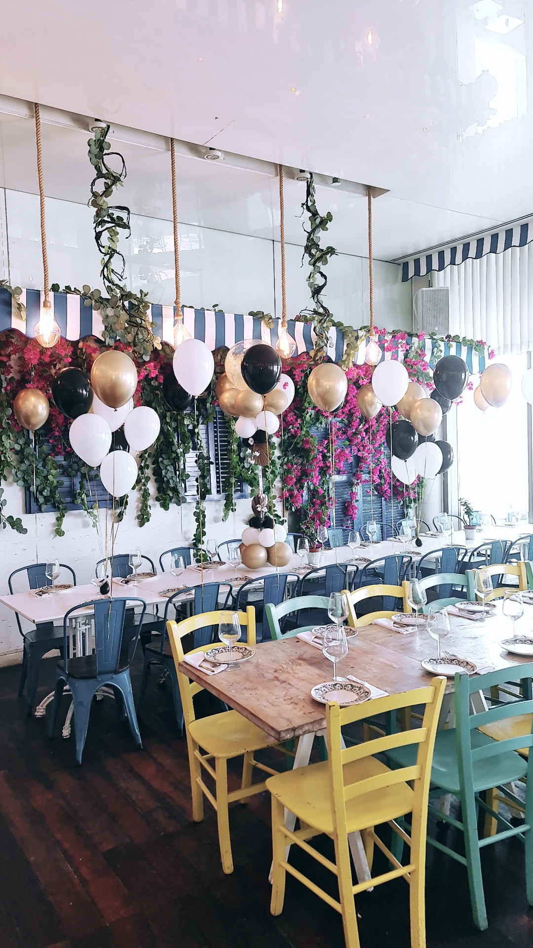 מרכזי שולחן בצבעי כחול כסף שקופים עם בלונים קטנים בצבעים תואמים והקדשה על הבלון השקוף