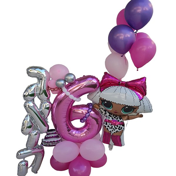 סטנד בלונים ענק בצבעי ורוד וכסף כרום מבריק בסגנון LOL עם זר בלוני הליום תואם